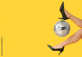 Female legs in stylish high heels with disco ball on yellow background