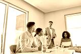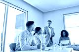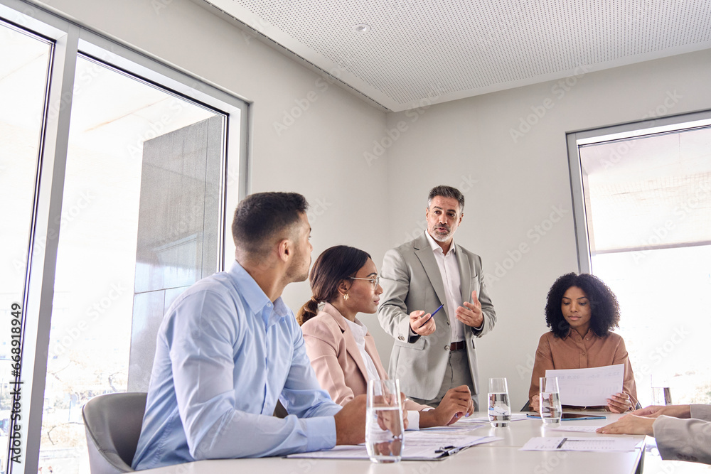Busy senior company professional executive leader ceo manager leading business conference meeting managing consulting diverse corporate team workers at table in office board room.