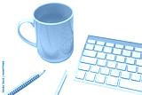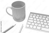 a cup of coffee on the desk, between a keyboard and a clipboard