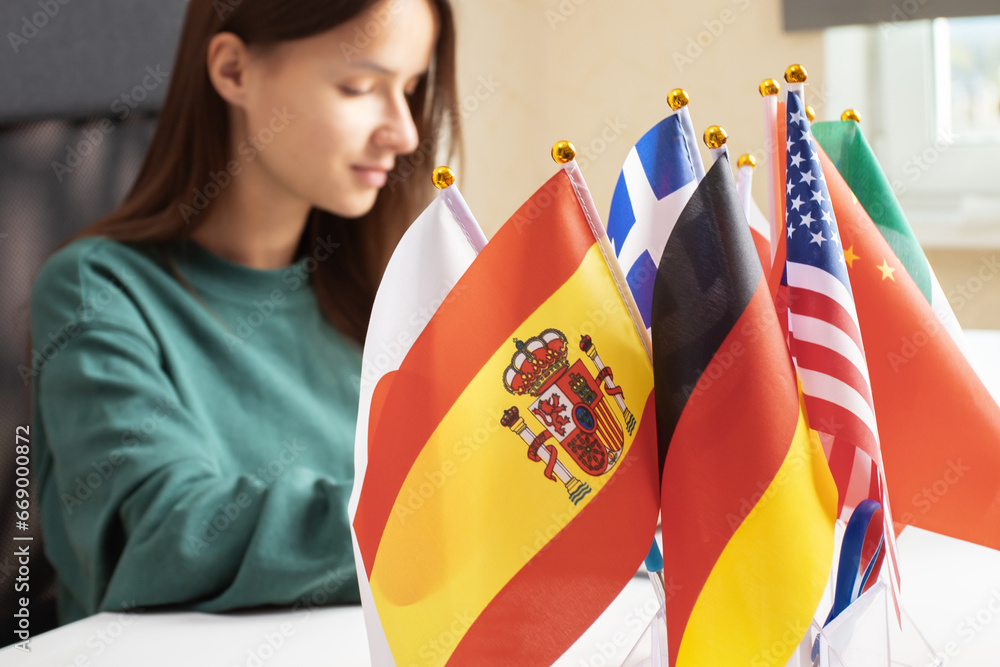language student, teenager studying against the background of flags of different countries, foreign education, language learning