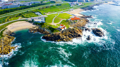 Aerial view of sea and rocks, ocean blue waves crashing on shore. Drone above of turquoise ocean waves crashing and white foaming on huge reef rock stones. Wild sea washing reef rock cliff.