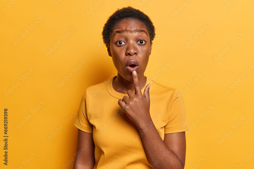 Omg concept. Stunned African girl with short hair feels amazed has widely opened mouth keeps finger on lips dressed in casual t shirt isolated over vivid yellow background emotionally reacts to news