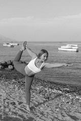 Young pretty woman performing Natarajasana yoga pose on the beach at sunset