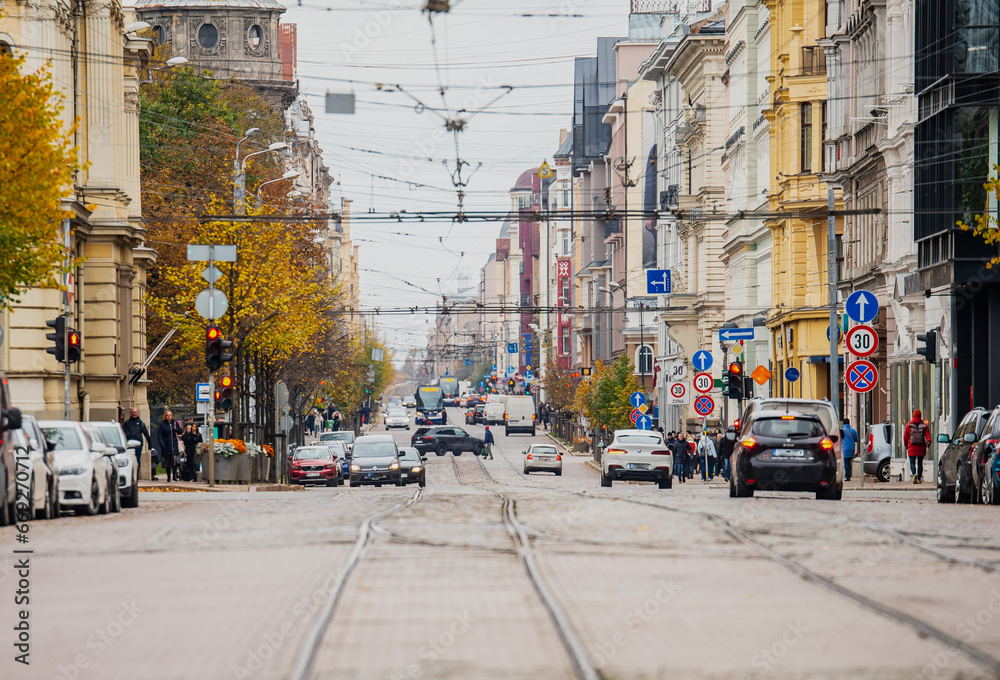 Riga streets of traffic and cars in autumn in Latvia