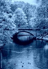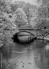Black and white infrared photo of autumn foliage and canal in city Riga, Latvia