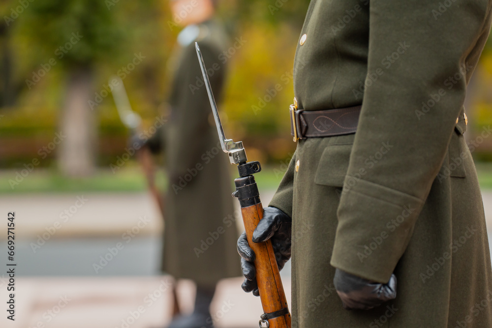Latvian national guard holding a weapon during a guard shift next to monument of freedom in Riga, Latvia