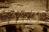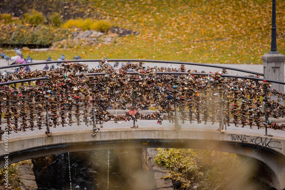 Hundreds of locks locked on the side of the bridge railing in Riga, Latvia. Symbol of love and unity in Europe during the wedding ceremony.
