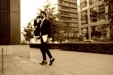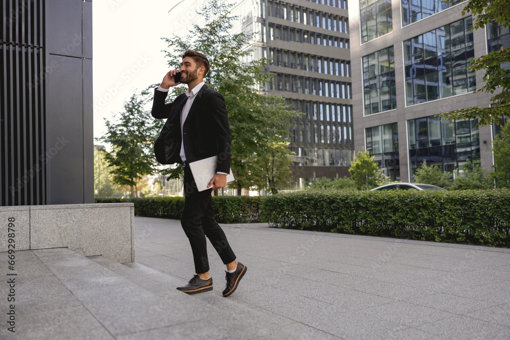 Smiling entrepreneur in suit talking by mobile phone standing on background of modern building