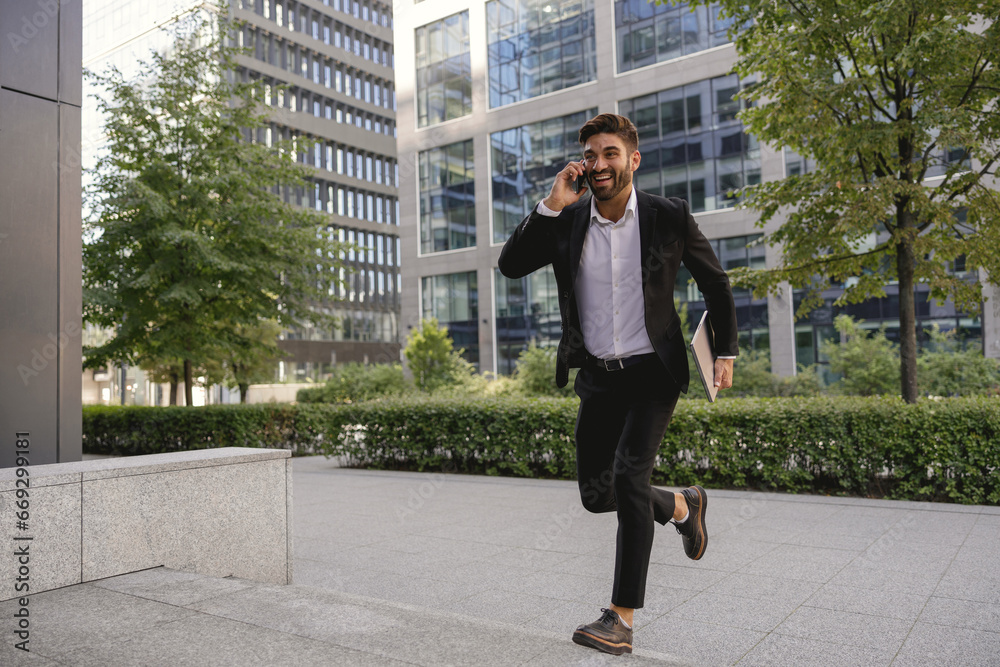 Businessman run and hurry up to office while talking phone with customers. High quality photo