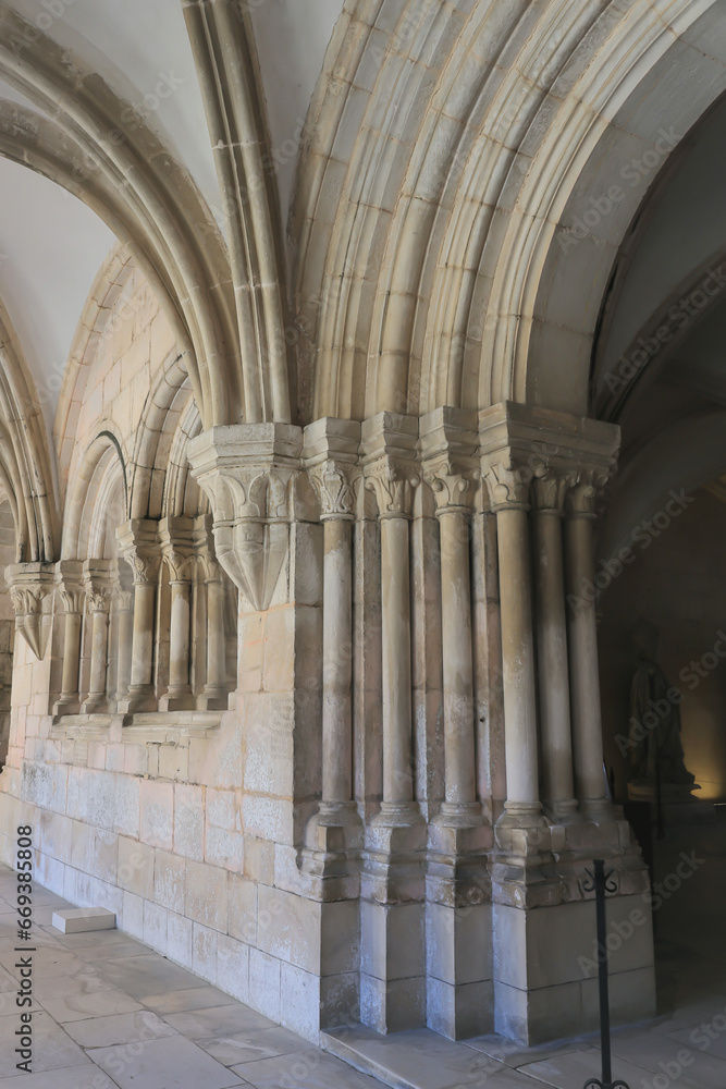 The interior of the historic Alcobasa Monastery with columns and arches, Portugal