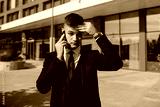 A Caucasian businessman, dressed in a sharp white-collar outfit, thoughtfully discusses business matters on his mobile phone against the backdrop of the city's architectural beauty.