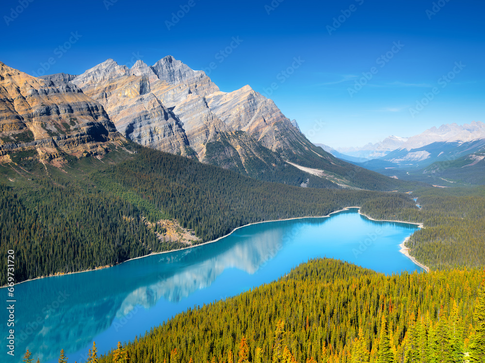 Lake Peyto, Banff National Park, Alberta, Canada. Landscape during daylight hours. A lake in a mountain valley. Mountains and forest. Natural landscape. Photo for postcards, background and wallpaper.