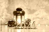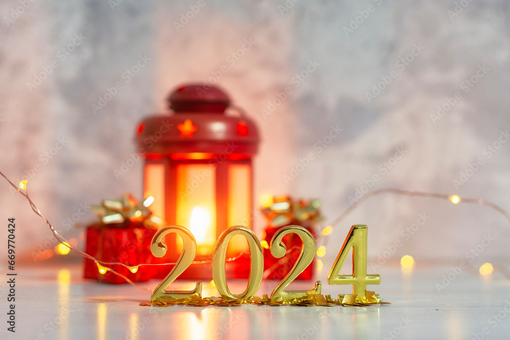 New Year holiday background. Golden numbers 2024 with bright glowing lights and a lamp with hot candles.