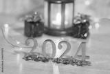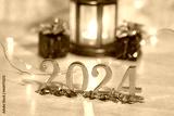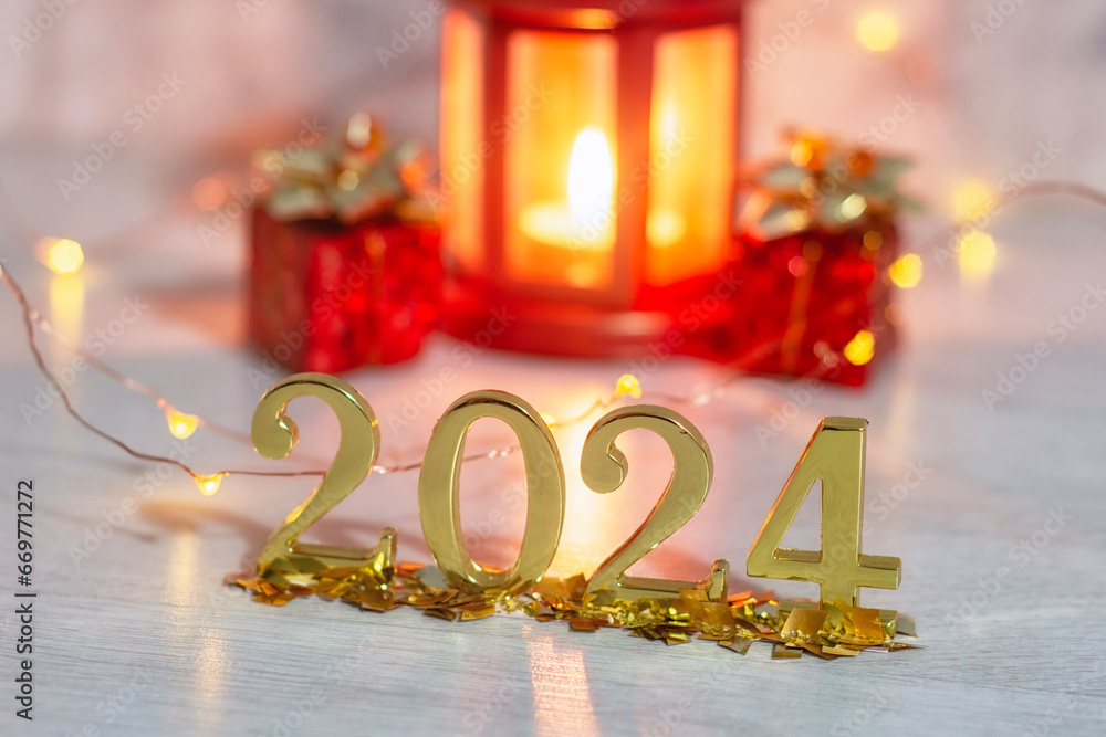 New Year holiday background. Golden numbers 2024 with bright glowing lights and a lamp with hot candles.