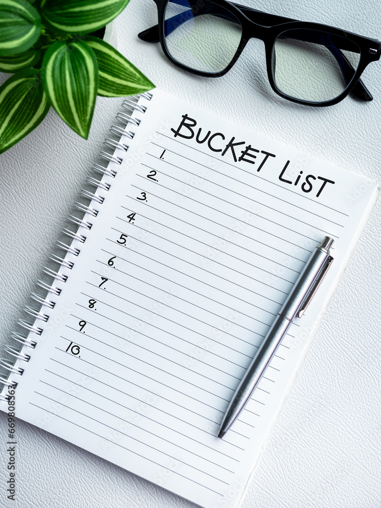 "BUCKET LIST," handwritten text font with Items 1 to 10 numbers on blank white page of white vertical spiral notebook. Concept of the list for experiences or achievements that a person hopes to have.
