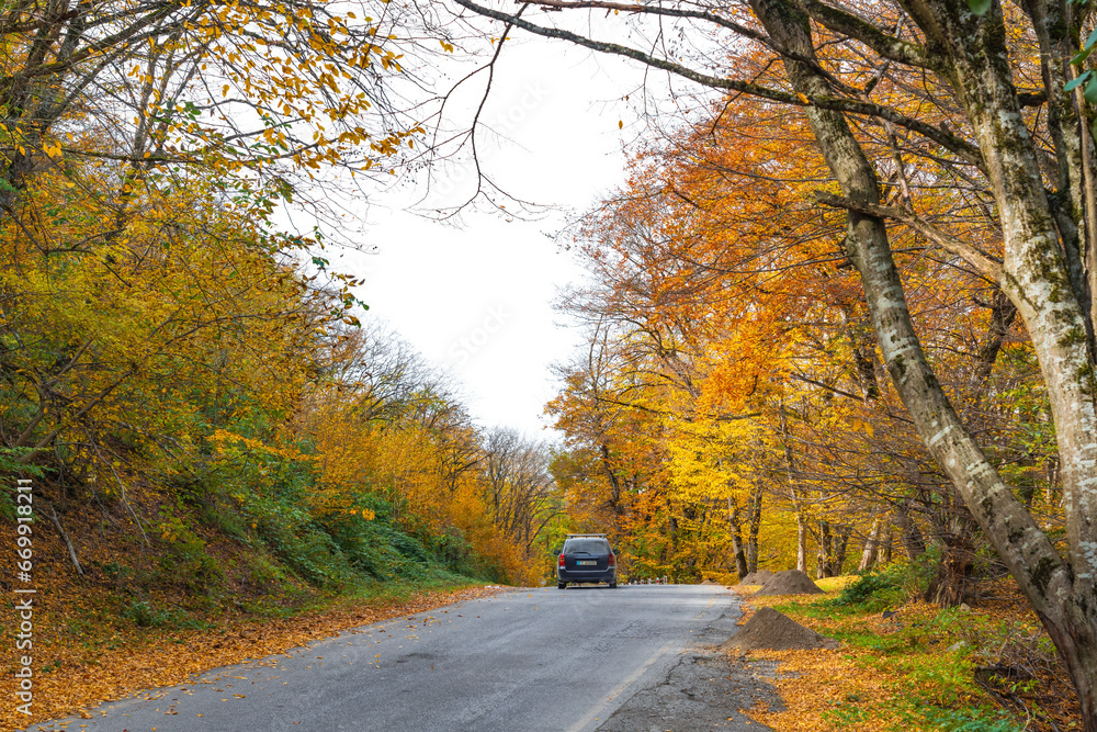 Asphalt road through yellow autumn forest