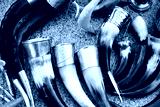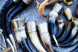 Vintage antiques, wine drinking horn, rhyton on a counter at a street flea market. Antique items