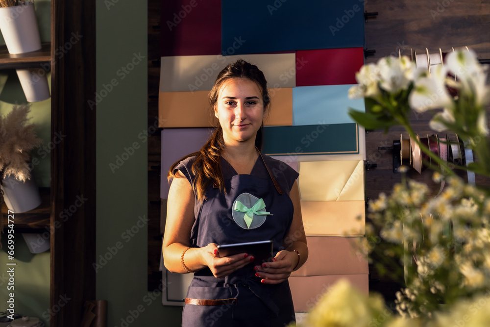 Portrait of young woman her flower shop holding tablet and looking at camera.