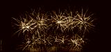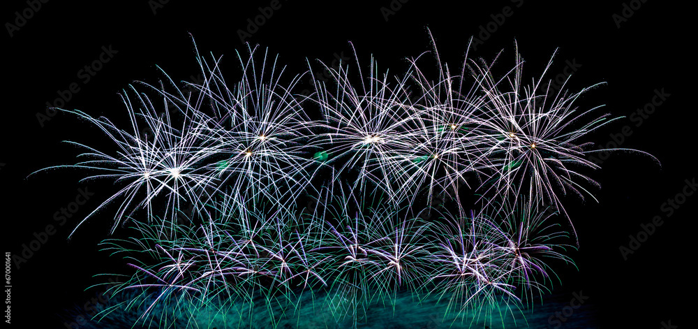 Colorful celebration fireworks isolated on a black sky background.