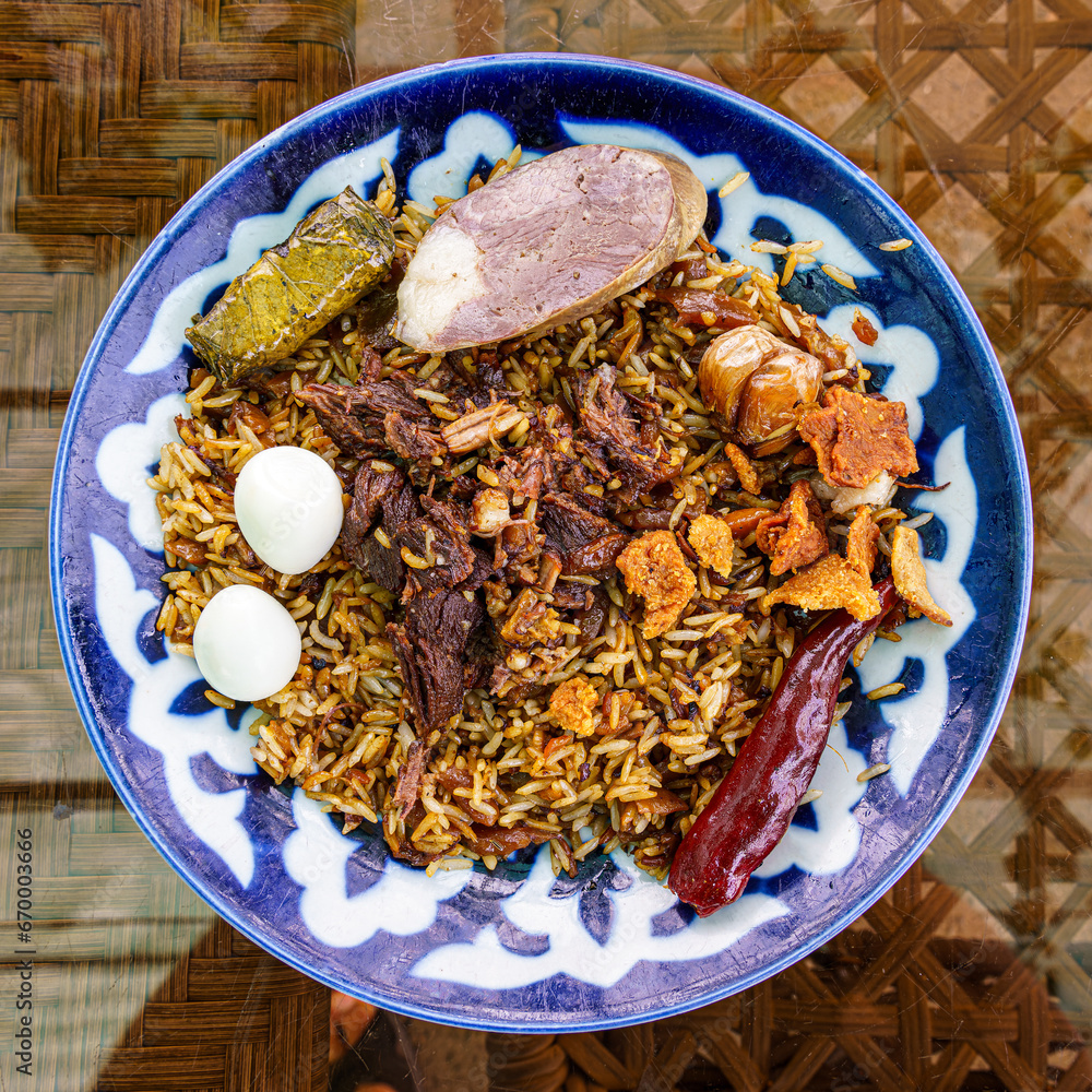 Top view of a plate with Uzbek oriental pilaf with pieces of lamb, horse meat, quail rice and chicken egg. Central Asian cuisine.