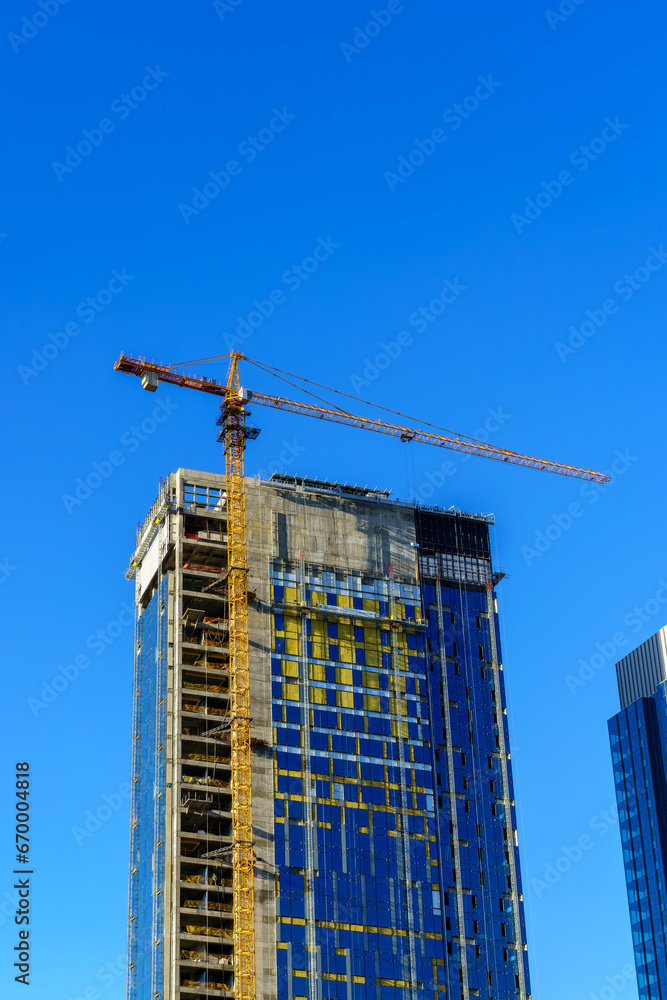 A crane building a skyscraper against a blue sky.