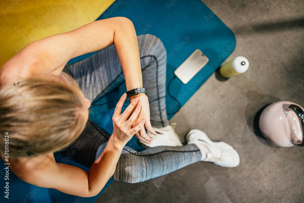 Young fit and attractive woman sitting and resting after fitness workout. She uses her wrist sport band or watch to track fitness data and accomplishments.