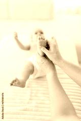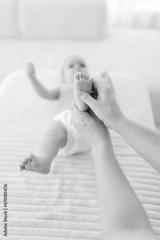 Vertical cropped shot of unrecognizable mother or masseuse massaging foot of infant baby. Little infant receiving feet reflexology at home. Concept of prophylaxis, relaxation and healthy development.