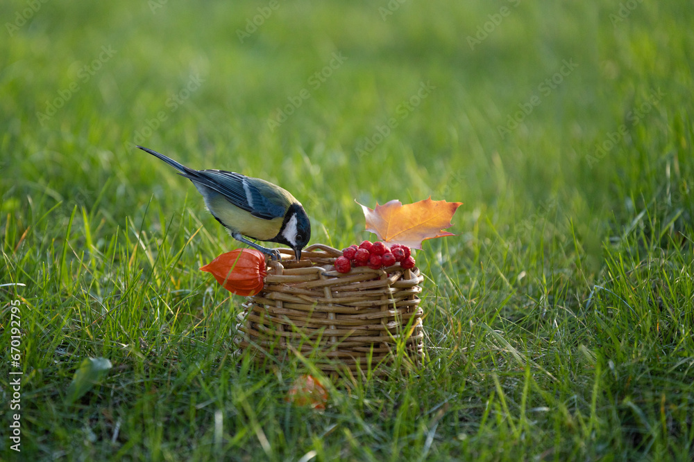 wild songbird flew to the feeder, titmouse sitting on the edge of the basket, autumn background