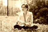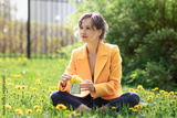 beautiful girl sitting on a field of dandelions, portrait of a woman in the park in spring