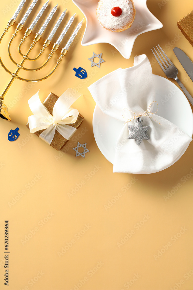 Hanukkah table setting with menorah, tableware, jelly donut top view.