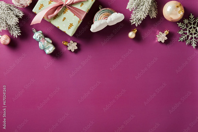 Christmas frame top border of vintage Christmas toys, ball ornaments, gift box on purple background. Flat lay, top view