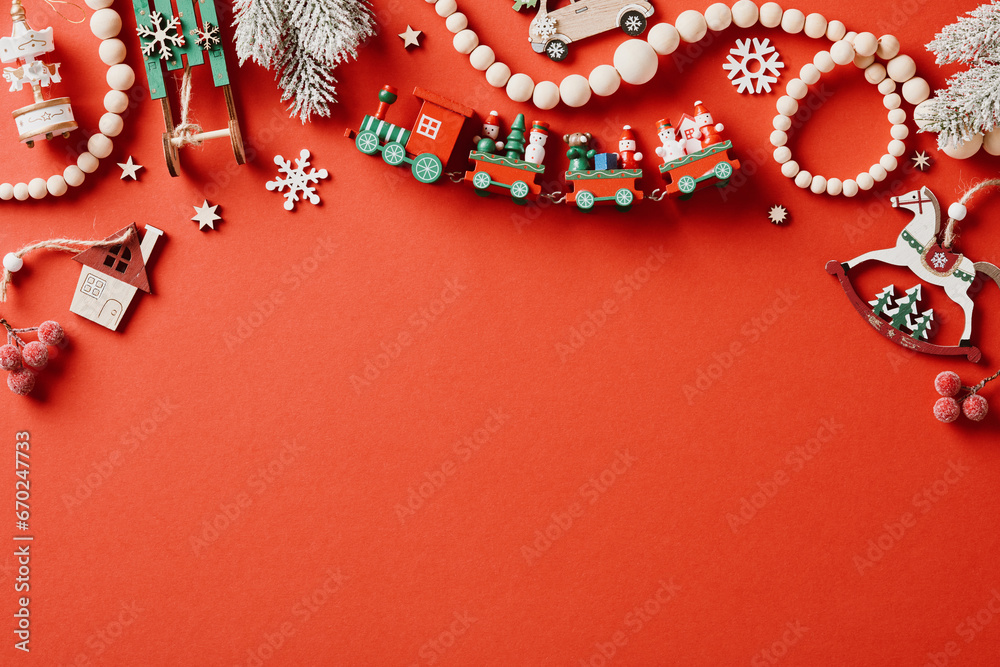 Frame of vintage Christmas craft wooden ornaments on red background.