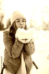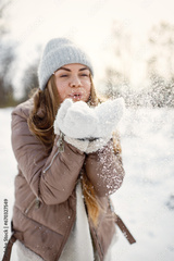 Portrait of a young woman standing in forest at winter day and blowng snow