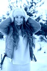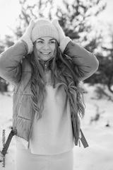 Portrait of a young woman standing in forest at winter day
