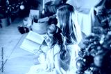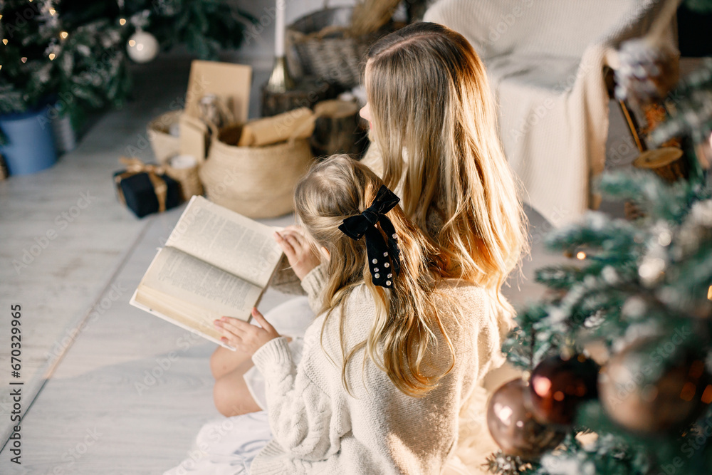 Young mother and little girl sitting christmas tree at home and reading a book