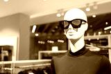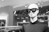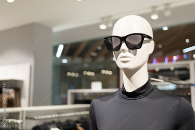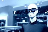 Mannequin wearing the sunglasses in the clothing store. Portrait mannequin and sunglasses.