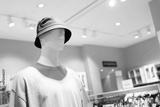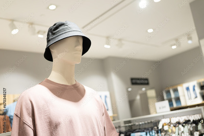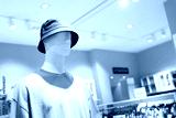 A mannequin with cap or hat. wearing unusual hat.