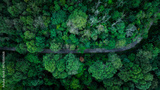 top view of curved road in green forest in the rain season, rural routes connecting city in the north of thailand, Ecosystem and ecology healthy environment concepts,
