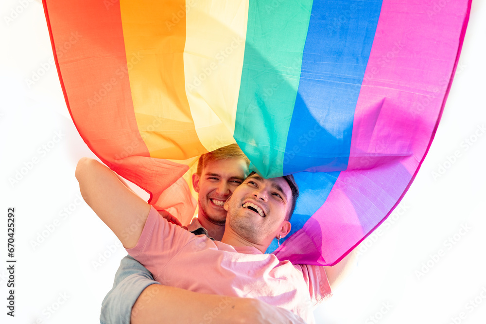 Portrait of young gay couple embracing and showing their love with rainbow flag, LGBT rights concept