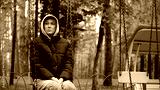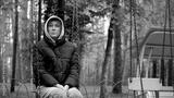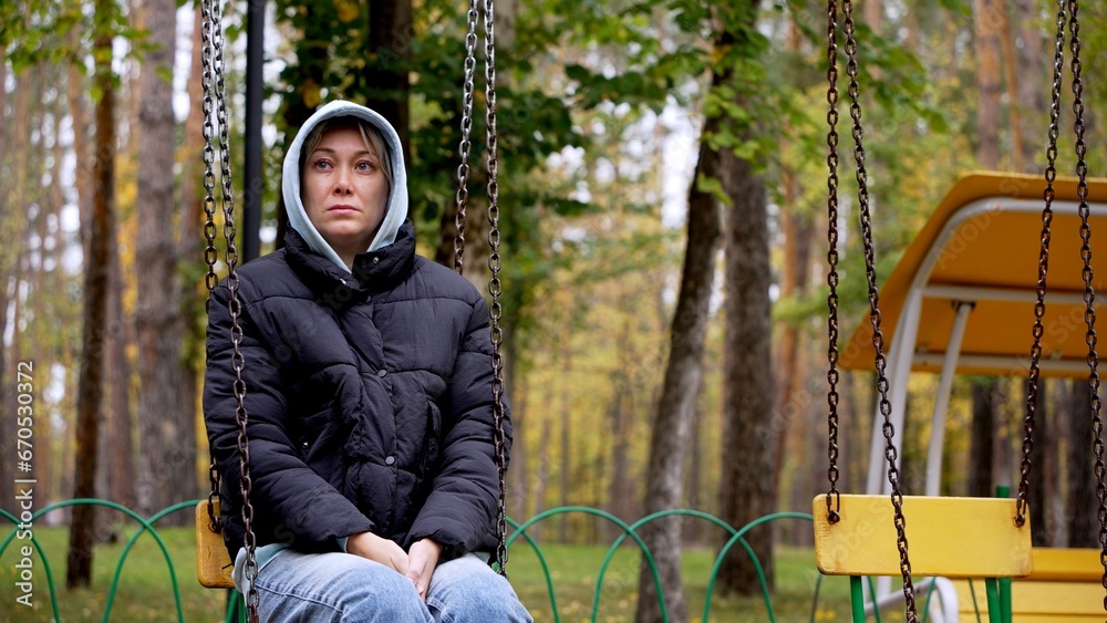 A beautiful young thoughtful woman is sad on a swing in a city park. A woman in warm clothes and a hood looks thoughtfully into the distance, worried about problems, depression and loneliness.