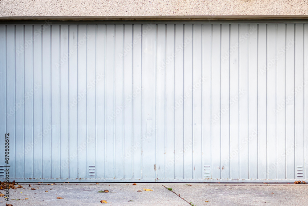 Enclosed modern garage door, lift up roller shutter door, grey wall,