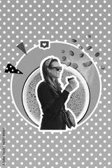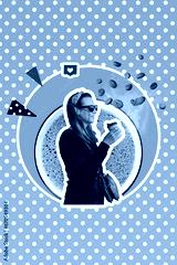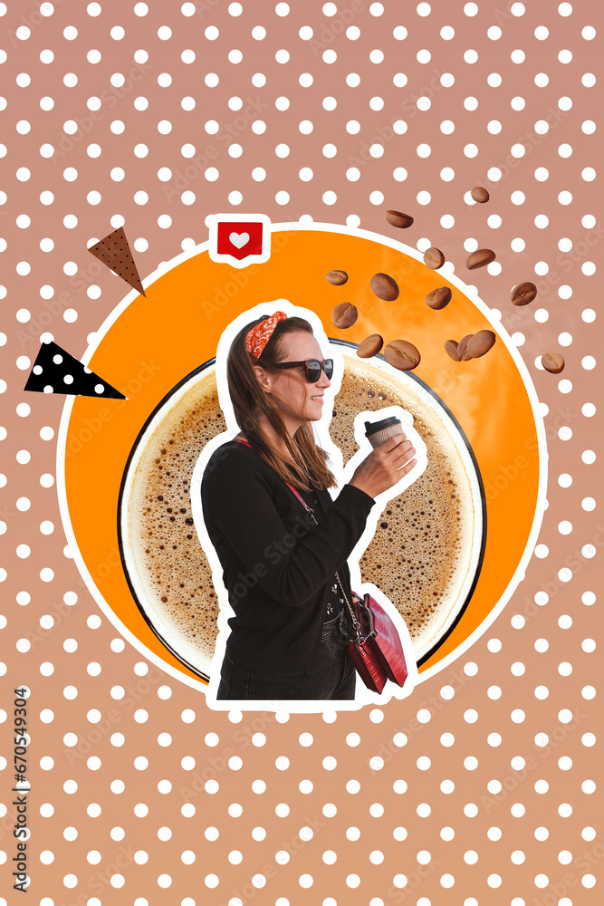 Creative digital collage stylish young woman in bandana hot coffee cup flying beans steam pastel gradient polka dot background. Contemporary style funky trendy graphic montage Coffee house advertising