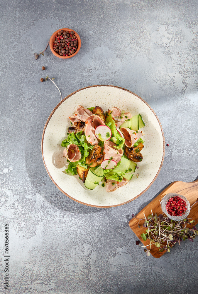 Vertical top-view of a delicious salad with baked meat and vegetables, served on a ceramic plate. Gray concrete background with ample copy space