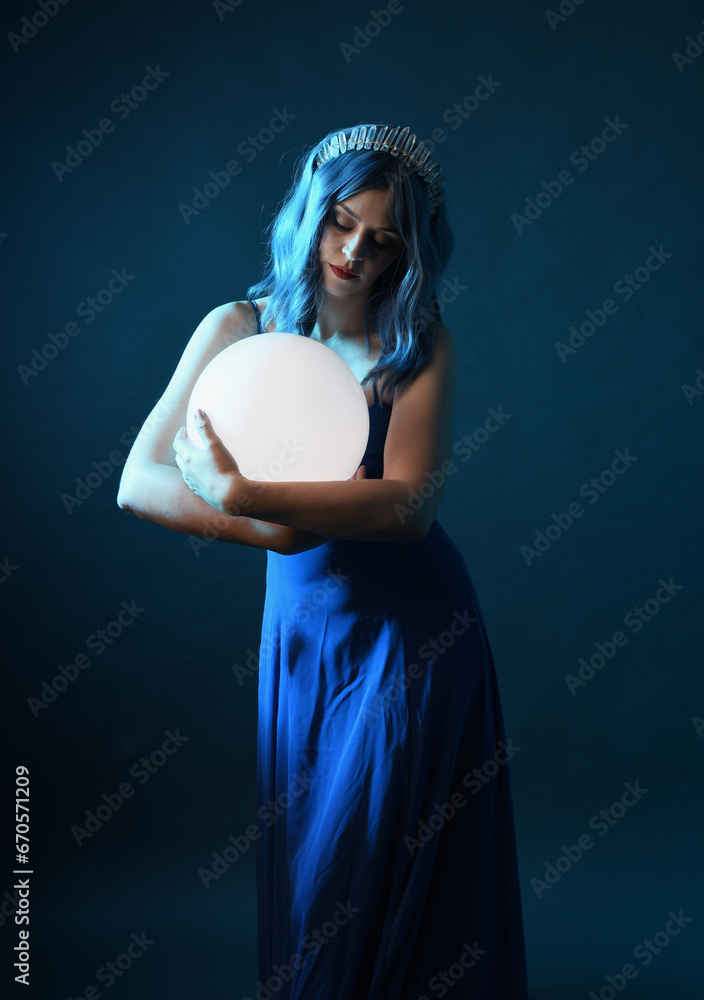 Close up portrait of beautiful female model with blue hair wearing glamorous fantasy ball gown, Crystal crown, holding glowing orb lamp in artistic gestural pose. isolated on dark studio background.