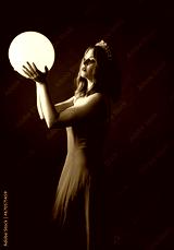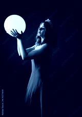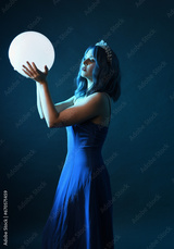 Close up portrait of beautiful female model with blue hair wearing glamorous fantasy ball gown, Crystal crown, holding glowing orb lamp in artistic gestural pose. isolated on dark studio background.