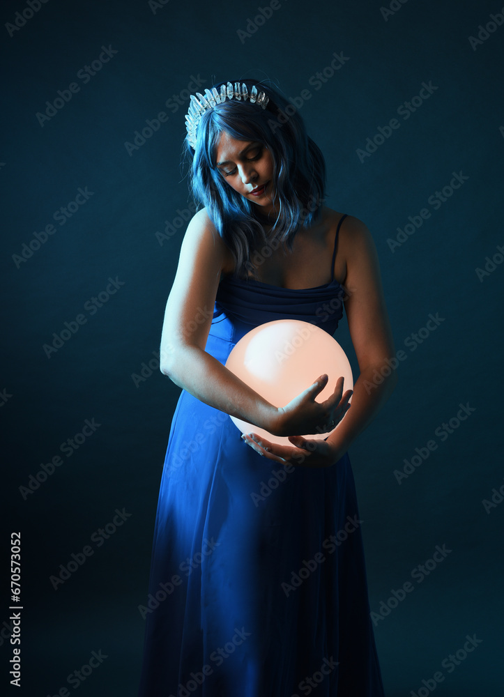 Close up portrait of beautiful female model with blue hair wearing glamorous fantasy ball gown, Crystal crown, holding glowing orb lamp in artistic gestural pose. isolated on dark studio background.