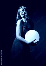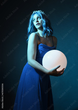Close up portrait of beautiful female model with blue hair wearing glamorous fantasy ball gown, Crystal crown, holding glowing orb lamp in artistic gestural pose. isolated on dark studio background.