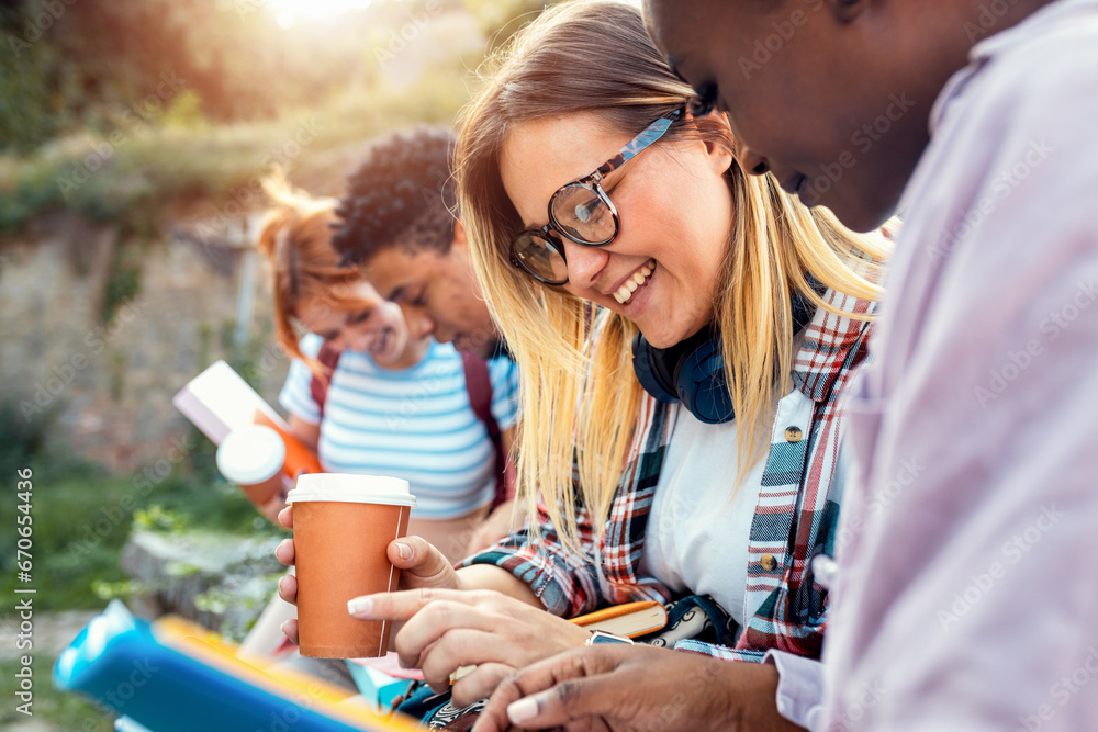 Diverse group of students sitting outdoor takling and learning together.