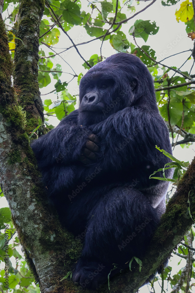 Silverback Mountain Gorilla sitting with his arms crossed in a tree