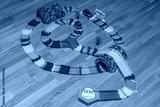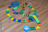 View of colorful click-click road for vibrant miniature battery-powered toy car track on wooden floor.